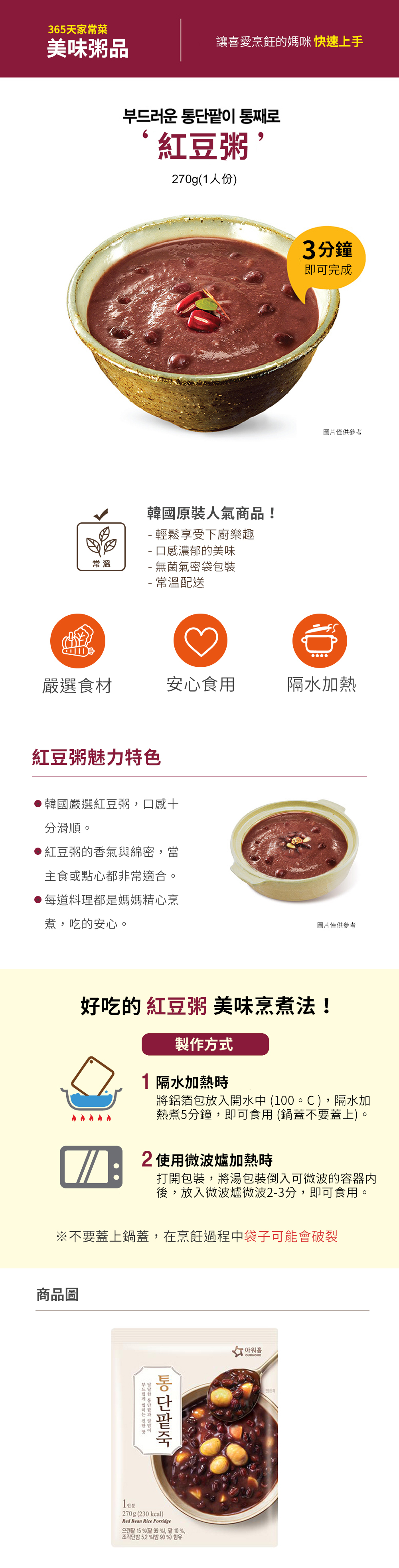 | 食用方法 | 1.用微波爐,將內容物倒入容器微波(700W)約2分鐘,(1000W)約1分30秒,即可食用 2.不需開封,隔水加熱煮沸約5分鐘,即可食用 |