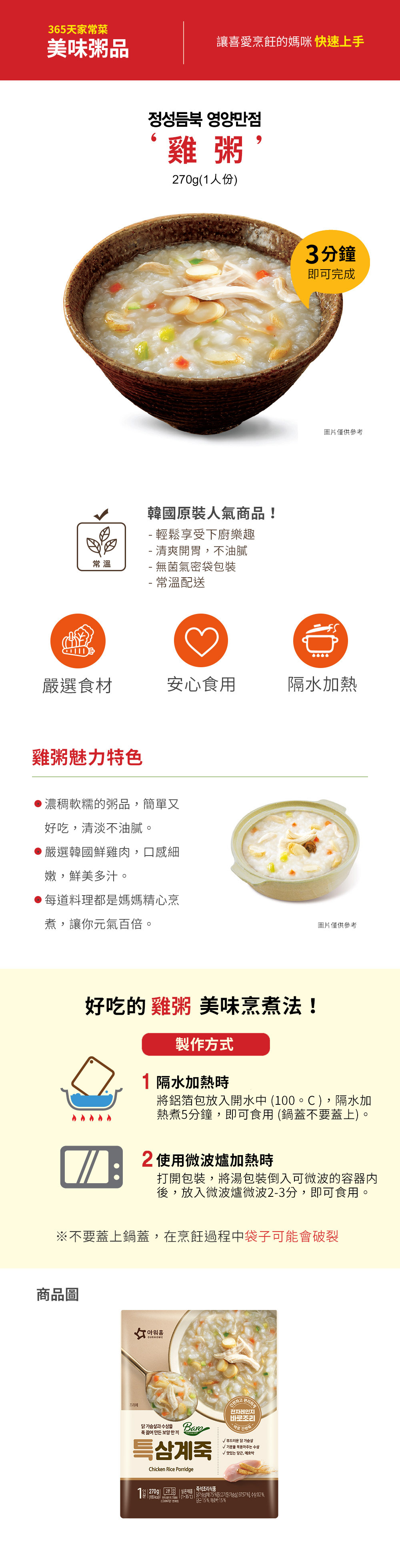 | 食用方法 | 1.用微波爐,將內容物倒入容器微波(700W)約2分鐘,(1000W)約1分30秒,即可食用 2.不需開封,隔水加熱煮沸約5分鐘,即可食用 |