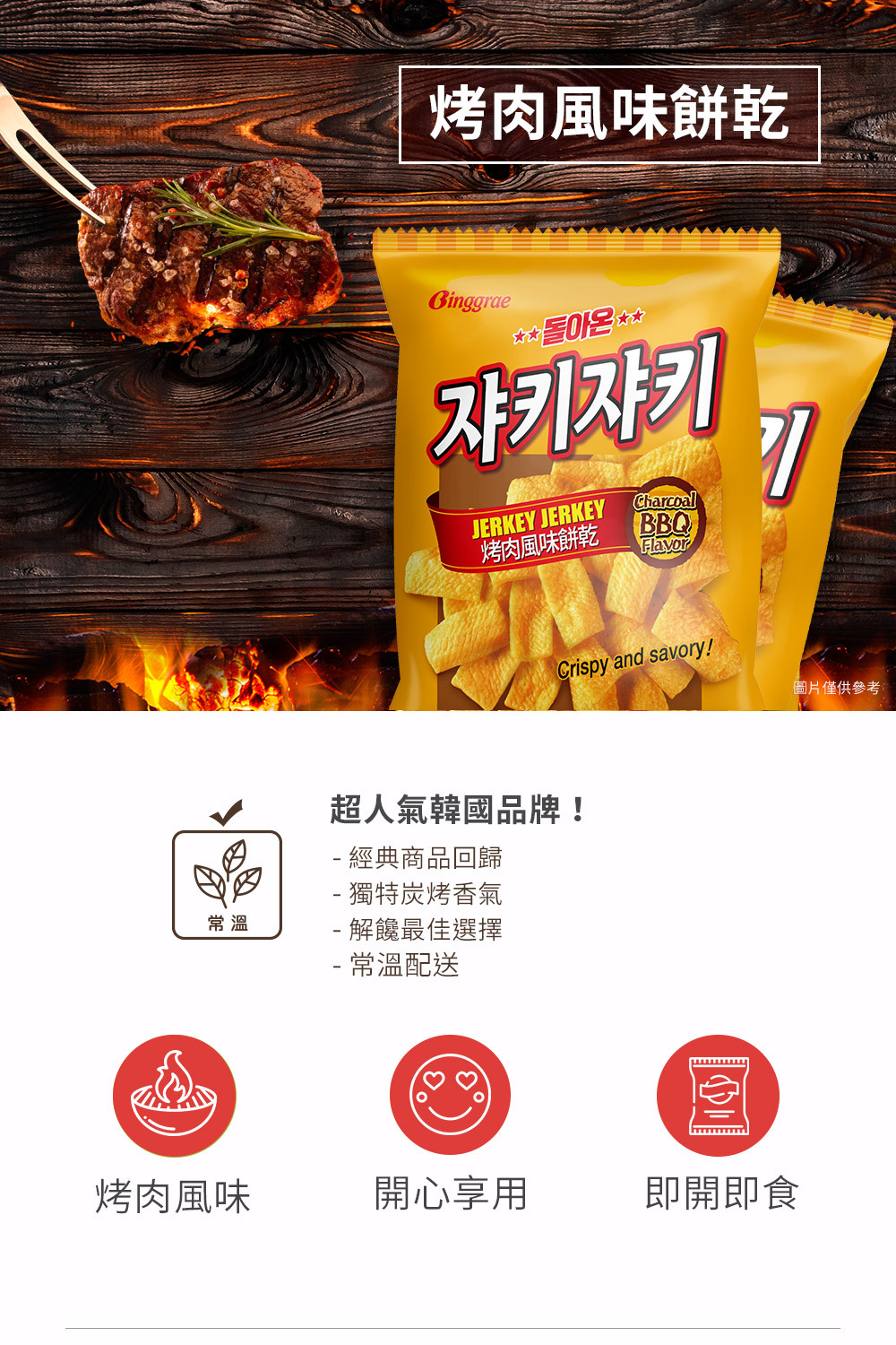 | 韓國Binggrae烤肉風味餅乾 | 小麥粉,軟質棕櫚油[軟質棕櫚油,抗氧化劑(混合濃縮生育醇)],玉米澱粉,烤肉調味粉(糖粉,牛肉調味粉(糊精,鹽,牛骨濃縮液,鹽),炒洋蔥粉,烤肉調味粉(糊精,鹽,葡萄糖,牛肉香料),L-麩酸鈉,磷酸鈣,醬油粉(小麥,大豆,鹽),DL-胺基丙酸,鹽),混合製劑(醋酸澱粉,糊精),糖,乾大蒜粉(乾蒜,玉米澱粉),烤牛肉調味粉[低糖,氨基酸提取物(脫脂大豆,水),鹽,混合蔬菜濃縮物(水,蘿蔔,大蔥,糊精,鹽),糖,牛肉提取物,酵母提取物,蒜粉,胺基乙酸,洋蔥粉,黑胡椒粉,焦糖色素,辣椒粉, DL-胺基丙酸,檸檬酸, 5’-次黃嘌呤核苷磷酸二鈉, 5’-鳥嘌呤核苷磷酸二鈉],鹽,炒洋蔥粉,混合製劑(辣椒提取物,紅麴色素),黃梔子色素 |