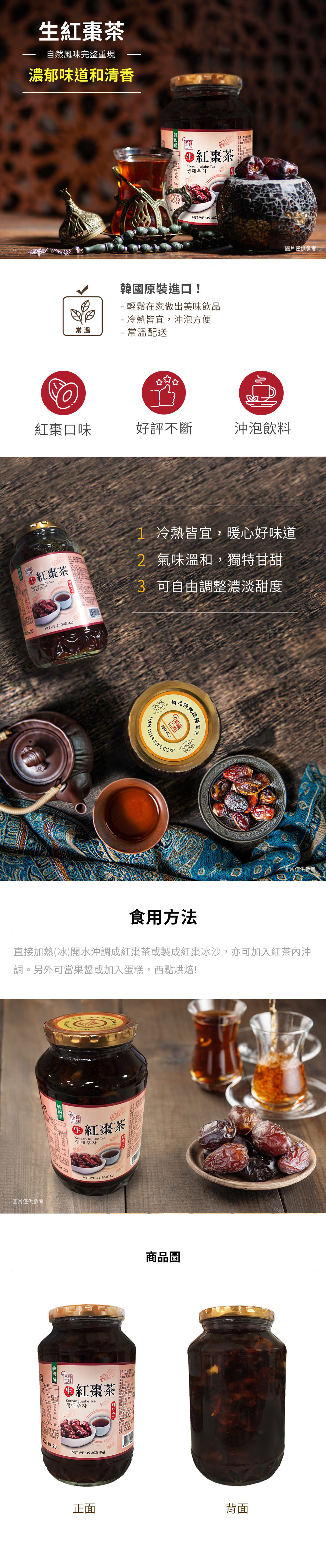 | 食用方法 | 直接加熱(冰)開水沖調成紅棗茶或製成紅棗冰沙,亦可加入紅茶內沖調。另可當果醬或加入蛋糕,西點烘焙 |
