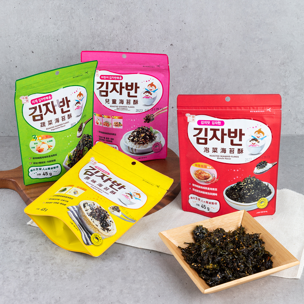 | 成份 | 成分:大豆油[大豆,抗氧化劑(維生素E),矽樹脂],海苔,糖,芝麻,大豆粉末,綜合蔬菜片(乾燥胡蘿蔔片,乾燥高麗菜片,乾燥洋蔥片,乾燥大蔥片),泡菜調味粉[葡萄糖,大蒜濃縮液(麥芽糊精,大蒜),鹽,辣椒粉,蘋果酸,生薑粉,紅甜椒粉,大蒜油(菜籽油,大蒜),阿斯巴甜(甜味劑)],味精(L-麩酸鈉) |