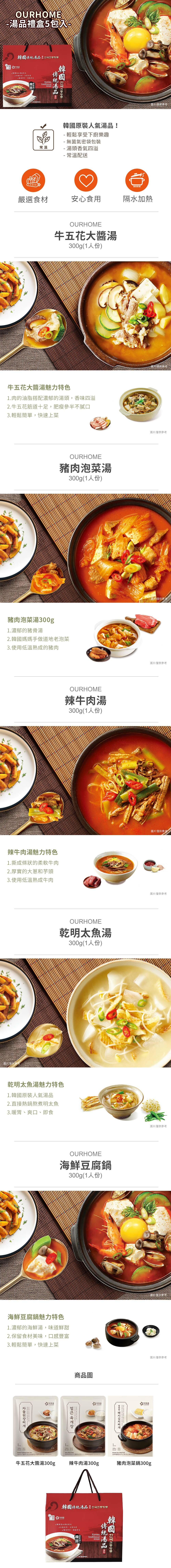 | 淨重 | 豬肉泡菜鍋-淨重 300公克/固形量: 108公克 乾明太魚湯-淨重 300公克/固形量: 49.2公克 辣牛肉湯-淨重 300公克/固形量: 58公克 牛五花大醬湯-淨重 300公克 / 固形量: 108.03公克 |