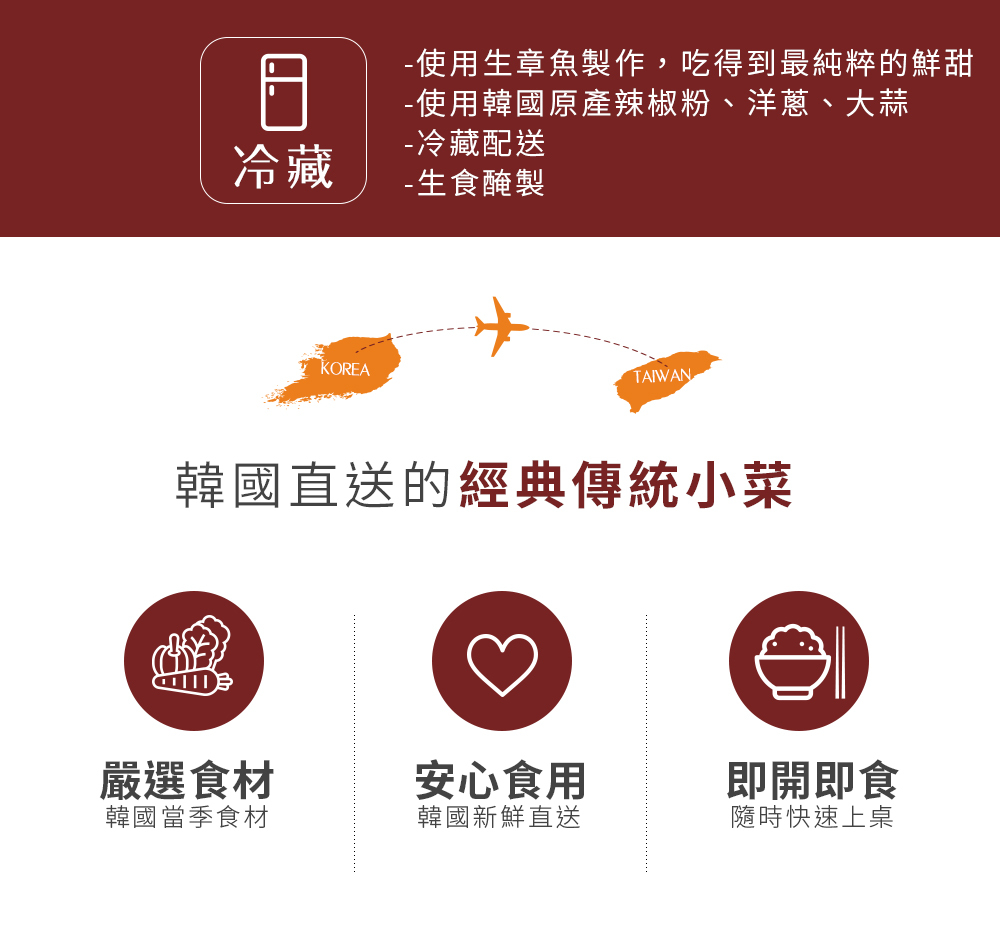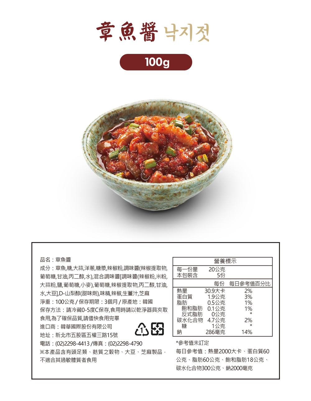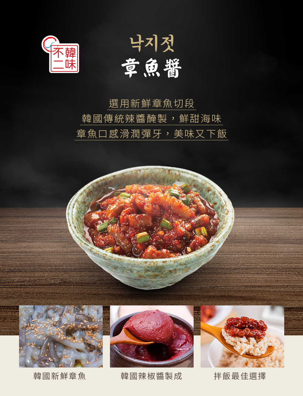 | 成份 | 章魚,糖,大蒜,洋蔥,糖漿,辣椒粉,調味醬(辣椒提取物,葡萄糖,甘油,丙二醇,水)混合調味醬[調味醬(辣椒粉,米粉,大蒜粉,鹽,葡萄糖,小麥)葡萄糖,辣椒提取物,丙二醇,甘油,水,大豆]D-山梨醇(甜味劑),味精,辣椒,生薑汁,芝麻 |
