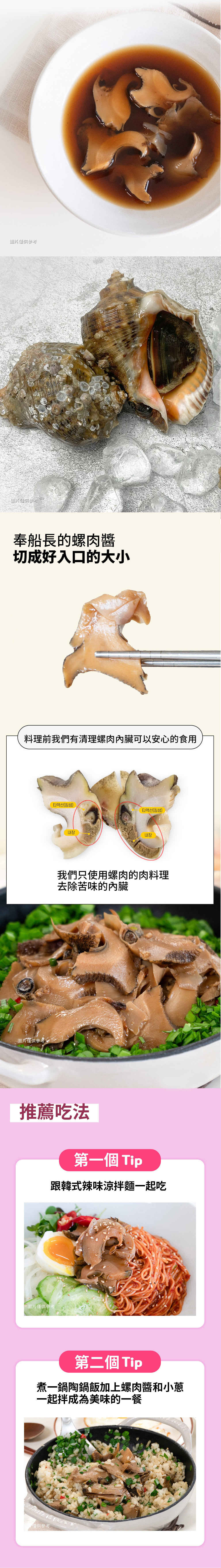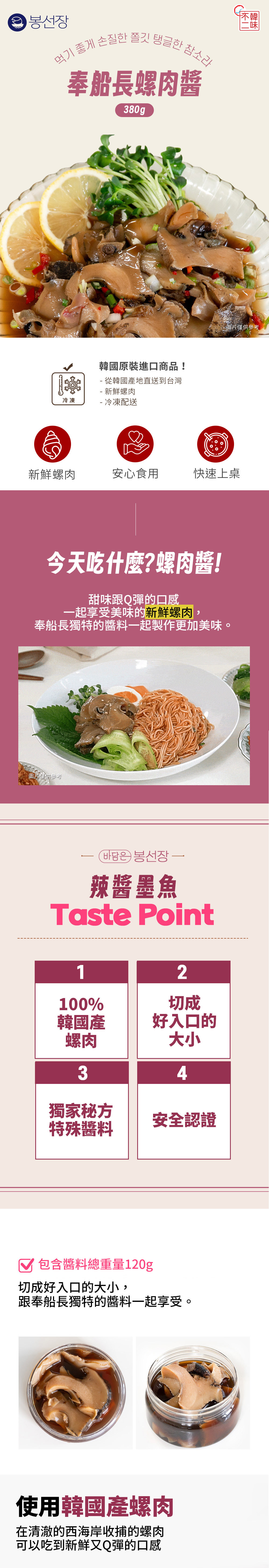 | 成份 | 螺肉, 醬油[醬油(氨基酸液{脫脂大豆},水,醬油原液{脫脂大豆,小麥,海鹽},食鹽,酒精,高果糖糖漿),水,水飴,碳酸飲料(水,糖漿{白糖},二氧化碳,檸檬酸,柑橘香料{含丙二醇},檸檬酸鈉,丙二醇),白糖(糖100%),洋蔥,青蔥,白蘿蔔,蘋果,大蒜,生薑,青陽辣椒,梅子風味液{高果糖糖漿,白糖,水,梅濃縮液,蘋果濃縮液,檸檬酸,檸檬酸鈉,胺基乙酸,焦糖色素(銨鹽焦糖),複方香料[梅子香料(酒精,水,香料,丙二醇,三乙酸甘油酯),混合水果香料(水,香料,丙二醇)]},乾香菇,乾沙丁魚,辣椒籽,乾昆布] |