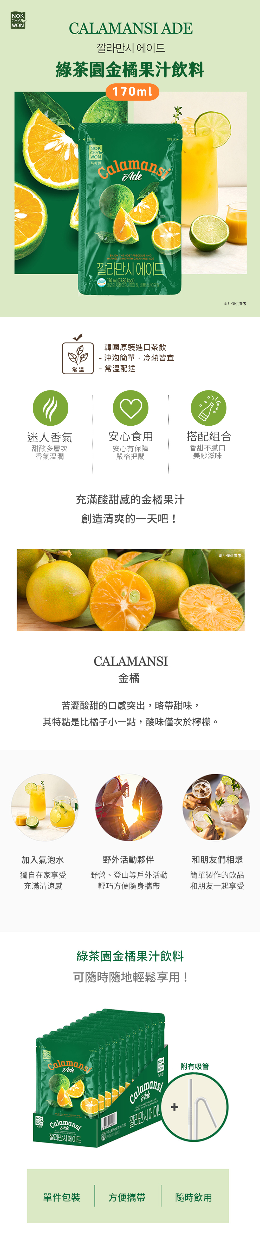 | 成份 | 水,糖,無水檸檬酸,金橘,檸檬香料,綠茶萃取物,維生素C(抗氧化劑),梔子黃色素,羧甲基纖維素鈉(粘稠劑),蔗糖素(甜味劑) |