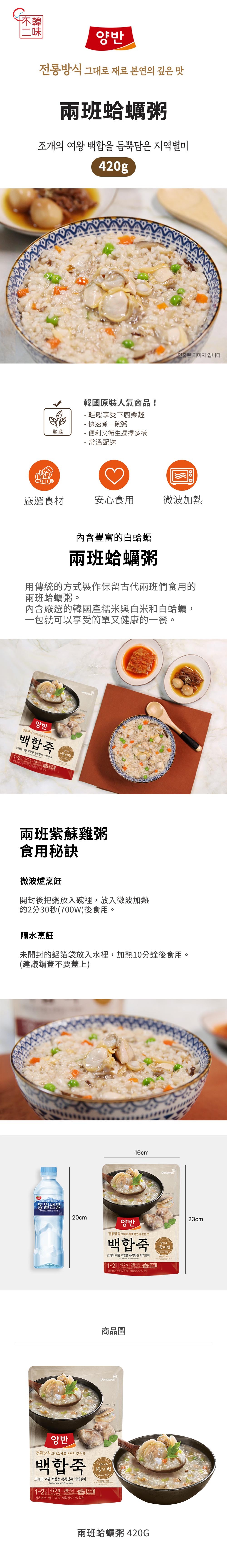 | 成份 | 水,綜合米(糯米,米),蛤蠣肉,蛤蠣高湯[蛤蠣濃縮液(蛤蠣萃取液),貝類濃縮液(淡菜濃縮液),小麥],胡蘿蔔,芝麻油,香菇乾,調味粉(糊精,芝麻油,大豆卵磷脂),洋蔥濃縮液 |