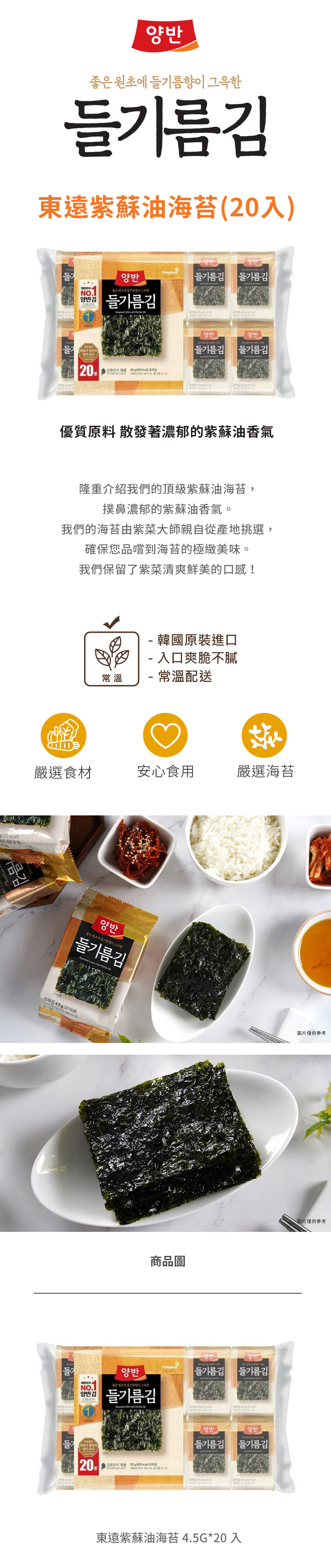 | 成份 | 海苔(條斑紫菜),油菜籽油,紫蘇油,玉米油,鹽,芝麻油,辣椒籽油,草本提取物(迷迭香提取物) |
