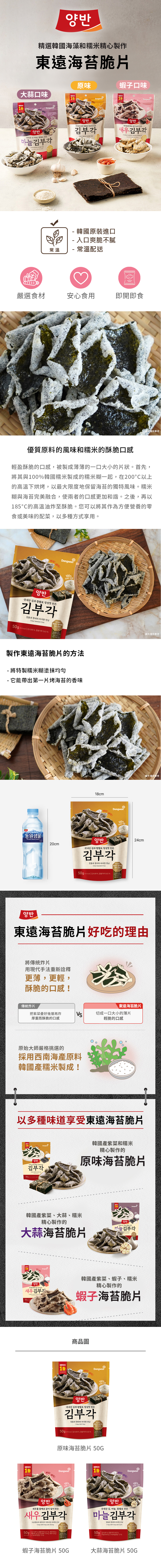 | 成份 | 米紙(木薯澱粉,米粉,鹽),油菜籽油,海苔(紫菜),海苔調味料{[海苔(紫菜),乳糖,多磷酸鈉,二氧化矽,鹽],醬油[醬油(脫脂大豆,麥芽糊精,鹽,糖,味精),糊精]},糯米粉,鹽,草本提取物(迷迭香提取物) |