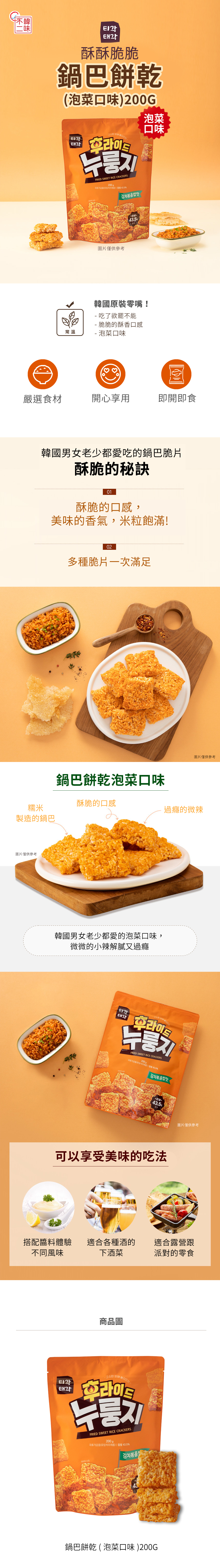 鍋巴(糯米,米),泡菜風味調味料[泡菜調味料(鹽,泡菜風味粉(白菜,鹽,辣椒粉,大豆,雞肉萃取物)),糖,泡菜基底(水,蘿蔔,白菜,辣椒粉,蝦),鹽,牛肉風味粉(鹽,黑胡椒粉,牛肉香料,乳清粉,小麥)],玉米油 |