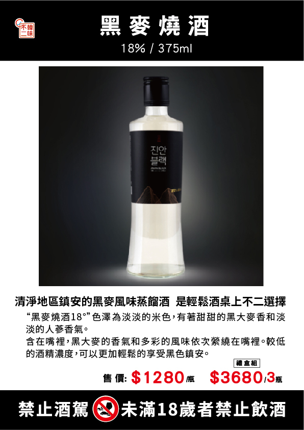 | 成份 | 米,黑大麥,麴菌,人蔘浸出液,紅蔘濃縮液,酒精,酵母,水,檸檬酸 產品種類:再製酒 酒精濃度:18% |