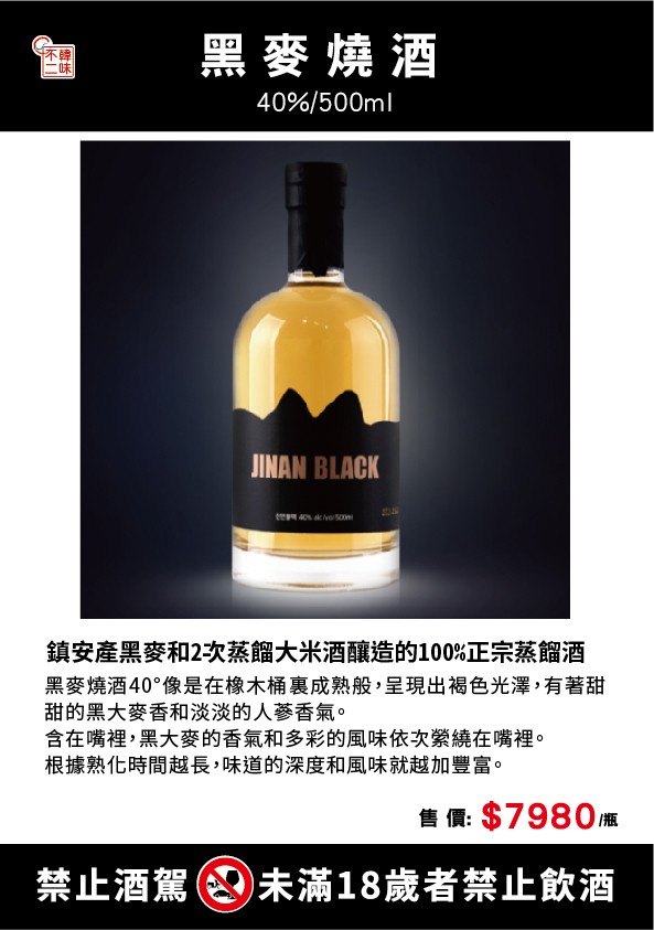 | 成份 | 米,黑大麥,麴菌,人蔘浸出液,紅蔘濃縮液,酒精,酵母,水 產品種類:再製酒 酒精濃度:40% |