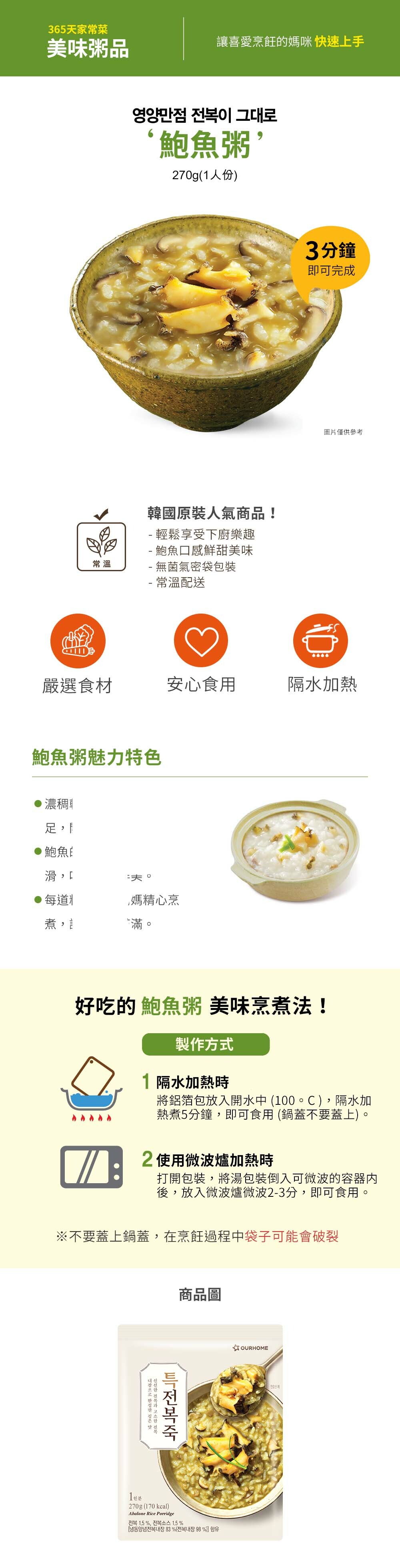 | 成份 | 水,米,海螺,蔬菜提取物(香菇片),鮑魚,鮑魚醬[冷凍調味鮑魚(鮑魚,L-麩酸鈉,鹽)],糯米,芝麻油,海鮮高湯濃縮液(蛤蜊提取物,玉米澱粉,糖,大豆,牛奶,小麥),米粉,混合劑(羥丙基磷酸二澱粉,麥芽糊精),大蒜,牛骨提取物,炒芝麻,鹽,L-麩酸鈉,蝦仁提取粉,蛤仔提取物,調味劑(5'-次黃嘌呤核苷磷酸二鈉、5'-鳥嘌呤核苷磷酸二鈉) |