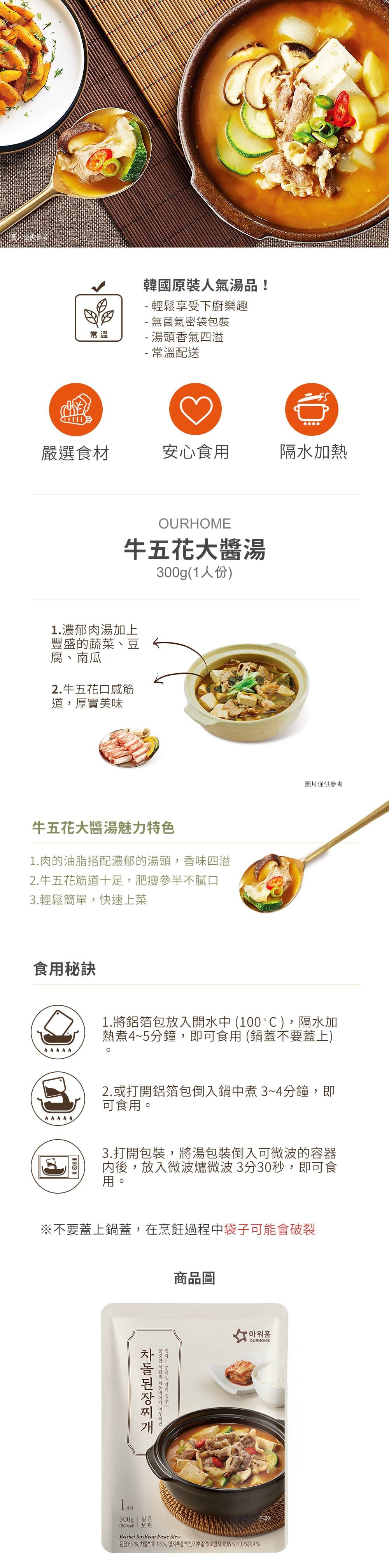 | 食用方法 | 1.加熱方式:將牛五花大醬湯1包放在湯鍋煮4-5分鐘,即可食用(不要蓋蓋子) 2.用湯鍋方式:把內容物倒入湯鍋蓋鍋蓋大火煮約3~4分鐘即可食用 3.用微波爐:內容物倒入微波爐容器轉3分半鐘(700w)即可食用 |
