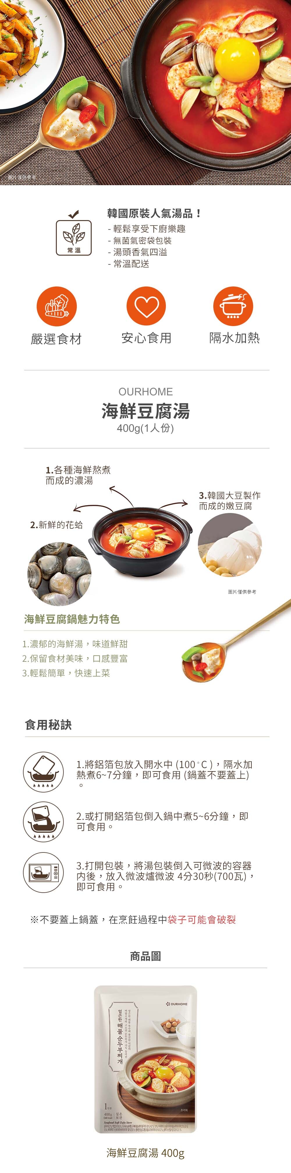 | 食用方法 | 1.隔水加熱:將海鮮豆腐湯1包放在湯鍋煮6-7分鐘,即可食用 2.用湯鍋方式:把內容物倒入湯鍋蓋鍋蓋大火煮約5分鐘即可食用 3.用微波爐:內容物倒入微波爐容器轉4分30秒(700w)即可食用 |
