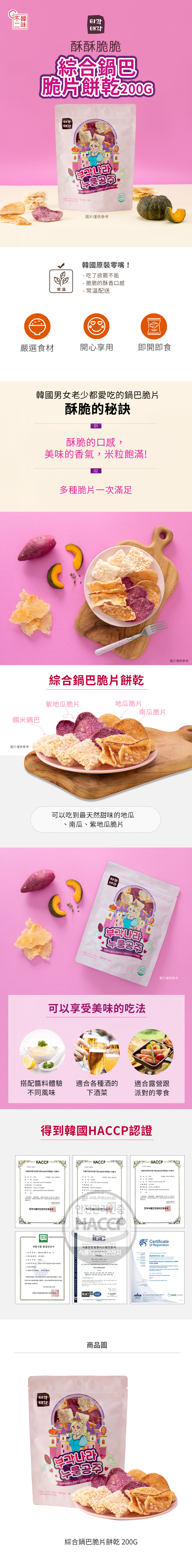 鍋巴[鍋巴(糯米,米),玉米油,糖,鹽],地瓜脆片(地瓜乾:越南產,玉米油,糖,鹽),紫番薯脆片(紫番薯乾:越南產,玉米油,糖,鹽),南瓜脆片(南瓜:越南產,玉米油,糖,鹽,小麥粉) |