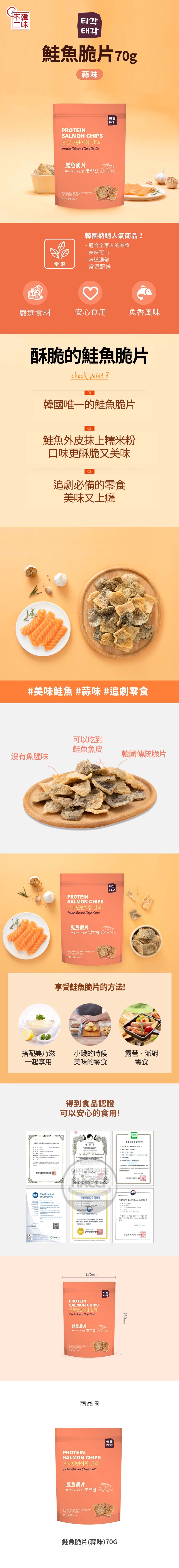 | 成份 | 鮭魚乾(鮭魚皮,糯米,米),蒜風味調味料[糖,蒜粉(蒜,糊精),葡萄糖,糊精,鹽],玉米油 |