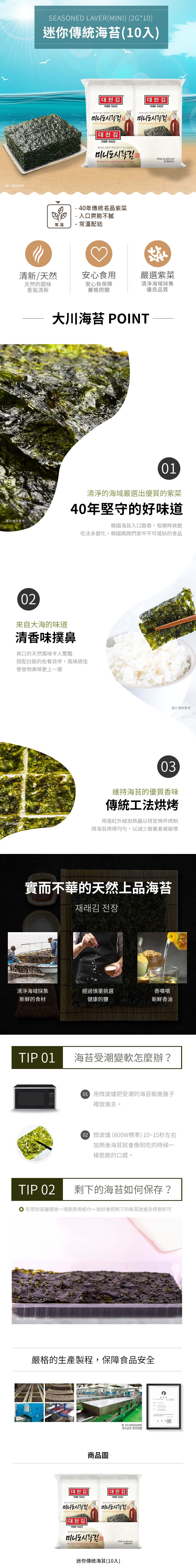 | 成份 | 海苔,菜籽油,芝麻油,調味鹽(精製鹽,L-麩酸鈉,5'-次黃嘌呤核苷磷酸二鈉、5'-鳥嘌呤核苷磷酸二鈉) |
