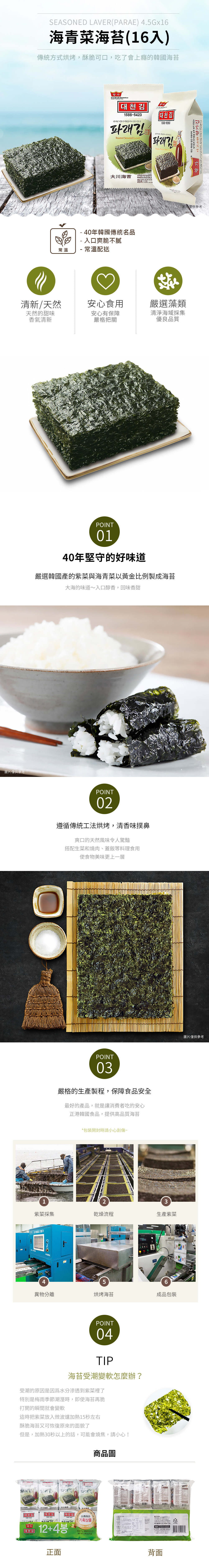 | 成份 | 海青菜海苔,菜籽油,紫蘇油,芝麻油,調味鹽(精製鹽,L-麩酸鈉,5'-次黃嘌呤核苷磷酸二鈉、5'-鳥嘌呤核苷磷酸二鈉) |