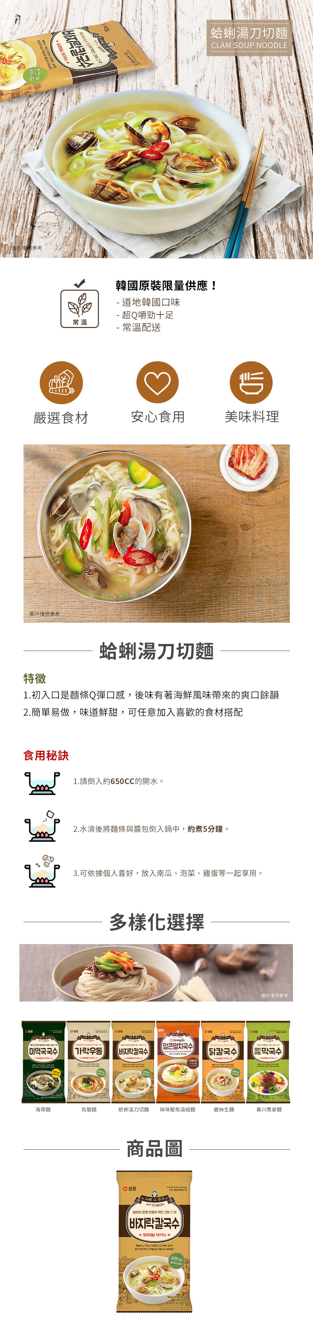 | 成份 | 麵條:小麥粉,精製鹽 蛤蜊湯粉包:精製鹽,調味醬[糊精,糖,調味劑(5’-鳥嘌呤核苷磷酸二鈉,5’-次黃嘌呤核苷磷酸二鈉),酵母提取物,精製鹽],葡萄糖,鯷魚調味料粉末(精製鹽,糊精,小麥粉,鯷魚粉末,糖), 複合蛤蜊提取物粉末[蛤蜊提取物粉末,糊精,精製鹽,調味劑(DL-胺基丙酸,胺基乙酸)], 胡蘿蔔乾,複合調味料粉末[牛肉調味料粉末(醬油,牛肉,鹽,糊精,味精,洋蔥,糖,玉米澱粉,葡萄糖, 酵母抽出物,甘胺酸,焦糖),調味料(糊精,醬油粉,牛肉濃縮液,醬油,鹽,味精,酵母抽出物,洋蔥)及調味劑(鹽,酵母粉,葡萄糖,麥芽糊精,醬油粉),精製鹽,糊精,葡萄糖],大蒜粉末,紫菜乾,青蔥乾,蝦粉末,混合物[玉米糖漿,椰子油,乾酪素鈉,磷酸氫二鉀,檸檬酸鈉],洋蔥粉末,魷魚調味粉末(魷魚濃縮液,糊精,魷魚,玉米糖漿,糖,醬油,甘油,DL-胺基丙酸, 5’-鳥嘌呤核苷磷酸二鈉,5’-次黃嘌呤核苷磷酸二鈉),貽貝粉末,調味劑(琥珀酸二鈉,胺基乙酸,DL-胺基丙酸, 5’-鳥嘌呤核苷磷酸二鈉,5’-次黃嘌呤核苷磷酸二鈉),牛骨提取物粉末,黑胡椒粉末,鯷魚粉末,小麥麵筋 |