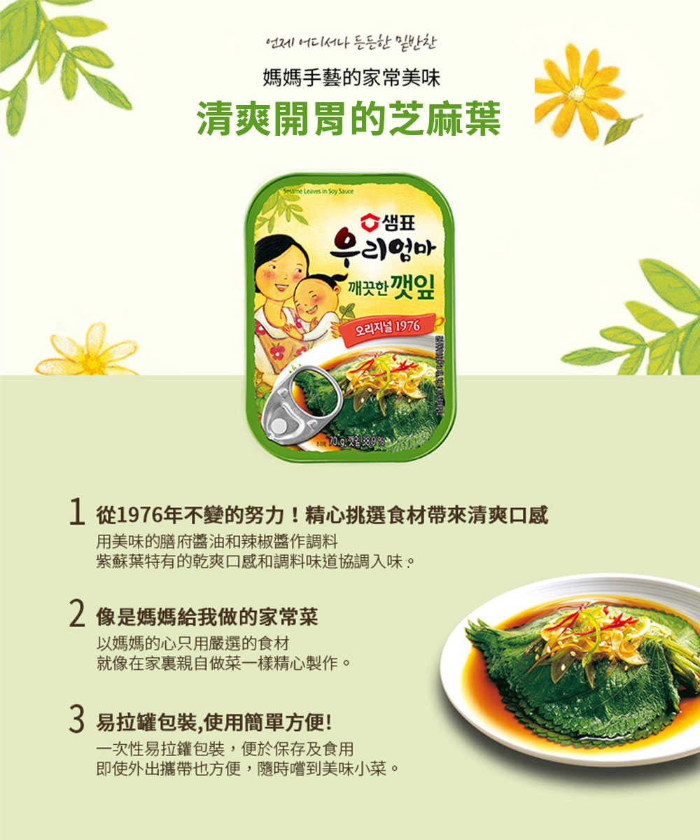 | 成份 | 醃芝麻葉(芝麻菜葉,鹽),水,醬油[脫脂大豆,高果糖玉米糖漿,海鹽,酒精,小麥,防腐劑(苯甲酸)],辣椒醬[玉米糖漿,小麥,調味辣椒(辣椒,鹽,大蒜,洋蔥),米粉,糊化小麥粉],糖,大蒜,辣椒粉,烤芝麻,辣椒籽油(辣椒籽,大豆油),醋,混合調味料(麥芽糊精,糖,5'-次黃嘌呤核苷磷酸二鈉,5'-鳥嘌呤核苷磷酸二鈉,酵母提取物粉,琥珀酸二鈉,鹽,檸檬酸),乳酸菌粉(乳酸菌Lactococcus lactis subsp. lactis) |