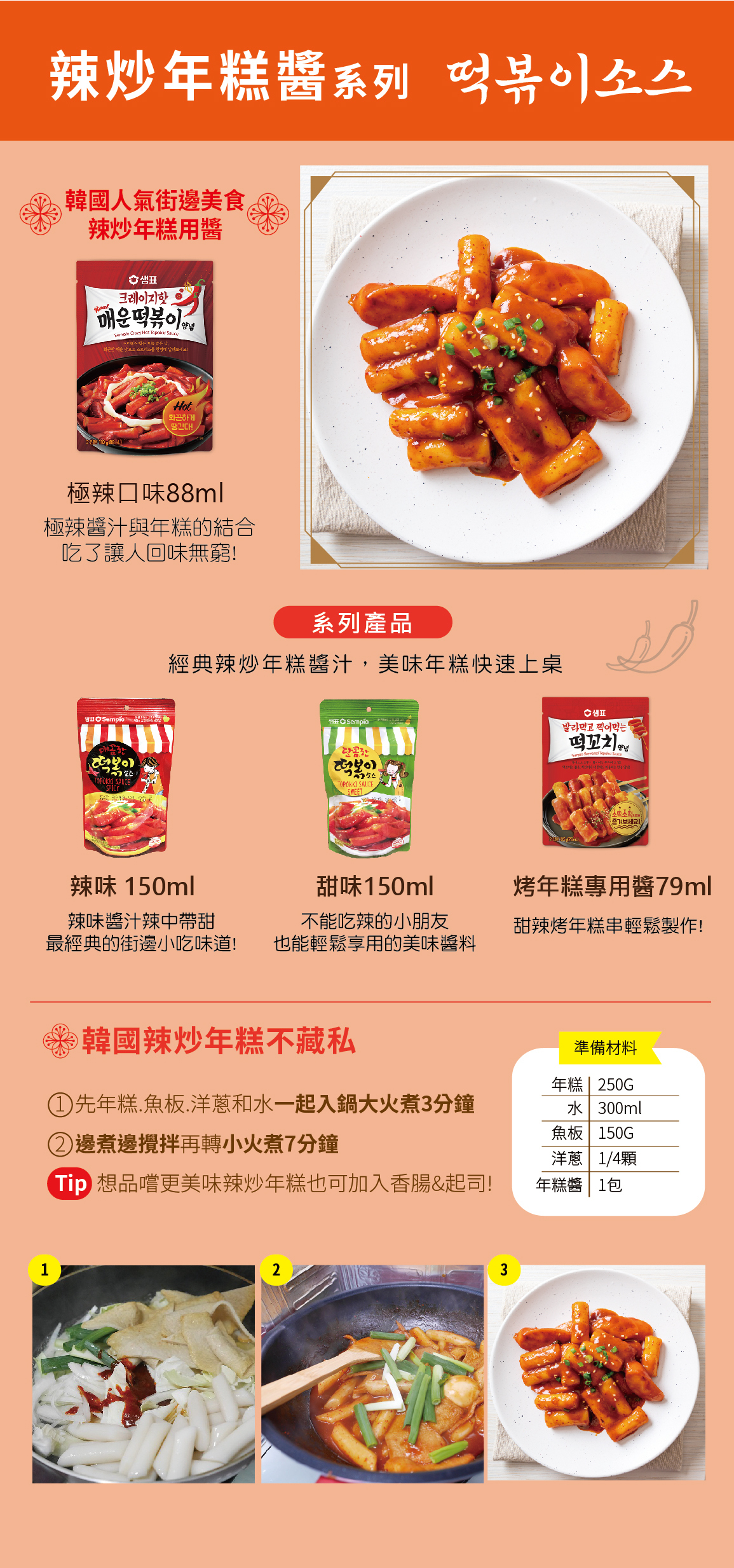 1.準備洋蔥、洋白菜、大蔥和魚板切成適當的大小 2.將年糕清洗後,在平底鍋中加入150ml的水和年糕,開火煮到年糕變軟 3.加入洋蔥、洋白菜、魚板和辣炒年糕醬,中火煮約3分鐘 4.最後放入大蔥用小火煮約2分鐘,即可食用 |