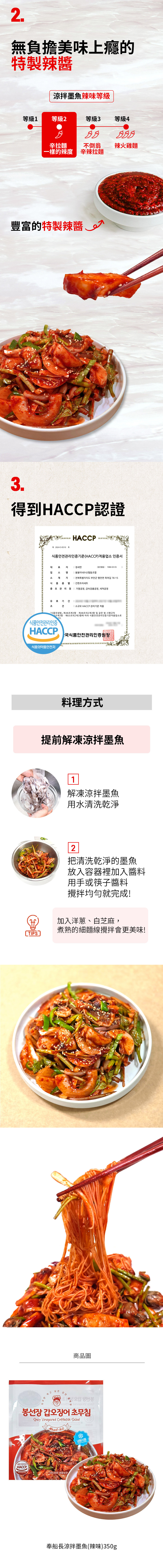 | 調理方法 | 方法一:解凍後即可食用 方法二: 1.將冷藏解凍後的墨魚,用水清洗後去除水分 2.將墨魚與醬汁一起攪拌後即完成(可依據個人喜好加上洋蔥等蔬菜及芝麻,會更好吃喔) |