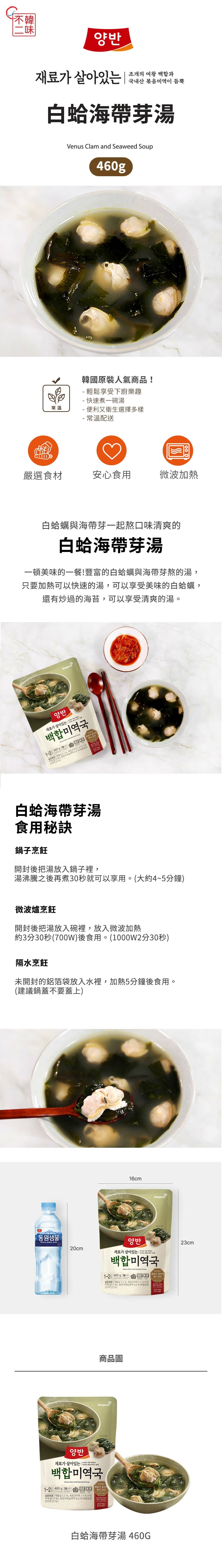 | 成份 | 水,白蛤肉,鳀魚昆布湯底[鯷魚昆布萃取液(鯷魚,蘿蔔,洋蔥,大蒜,昆布,水),玉米製品(玉米澱粉),鯷魚風味製品(鯷魚濃縮液,鹽,麥芽糊精,關華豆膠),鹽,葡萄糖,醬油(水,大豆,小麥,鹽,酒精),黑胡椒粉],炒乾海帶(海帶,油菜籽油),大豆發酵液(大豆,鹽),調味粉(糊精,芝麻香油,卵磷脂),蛤蜊濃縮液,大蒜,炒海帶濃縮液,蔬菜混合濃縮液(大蔥,洋蔥,蘿蔔,鹽,糖漿),芝麻油,淡菜蔬菜抽出液(淡菜,大蔥,洋蔥),L-麩酸鈉,5'-次黃嘌呤核苷磷酸二鈉,5'-鳥嘌呤核苷磷酸二鈉,鹽 |
