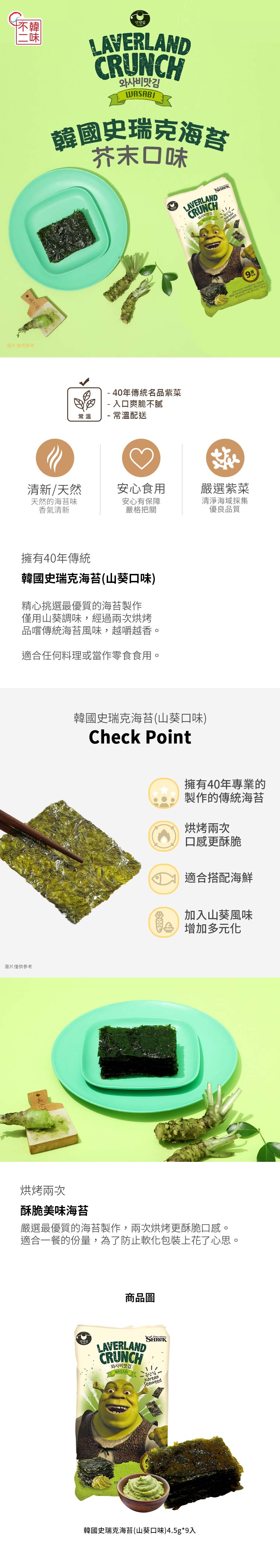 | 品名 | 韓國史瑞克海苔(山葵口味) |