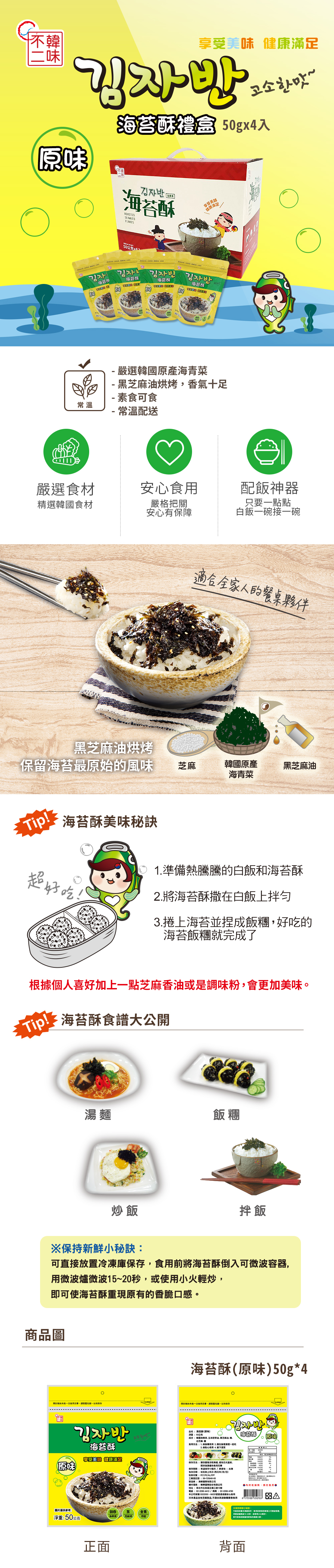 | 成份 | 韓國海青菜,玉米胚芽油,黑芝麻油,糖,白芝麻,鹽 |
