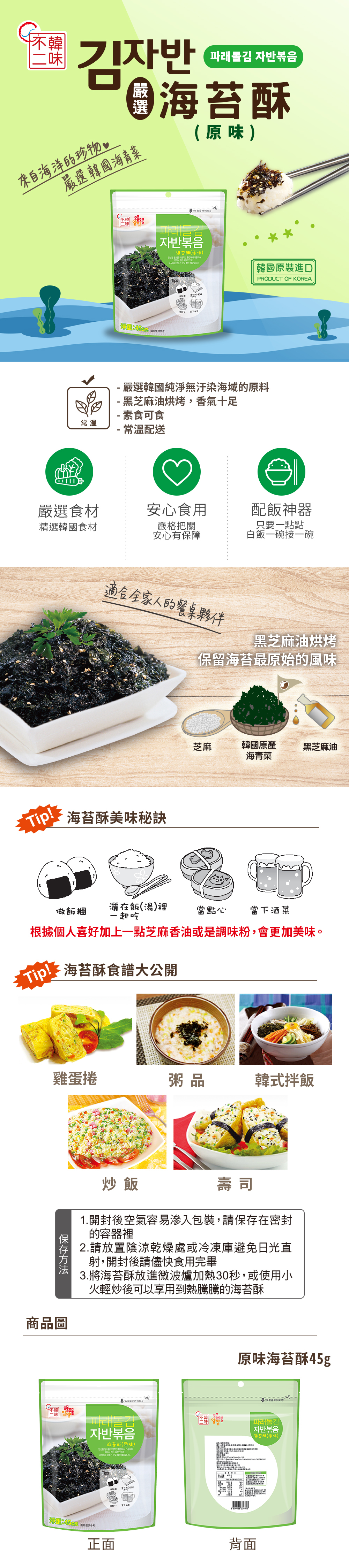 | 成份 | 大豆油,海苔酥,糖,芝麻,味精(L-麩酸鈉),大豆粉末 |