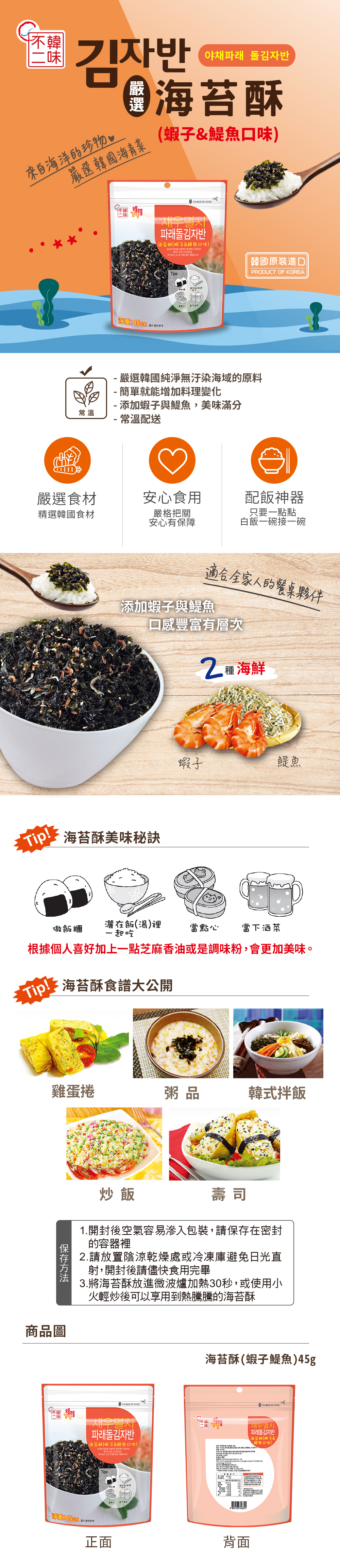 | 品名 | 海苔酥(蝦子&鯷魚口味) |