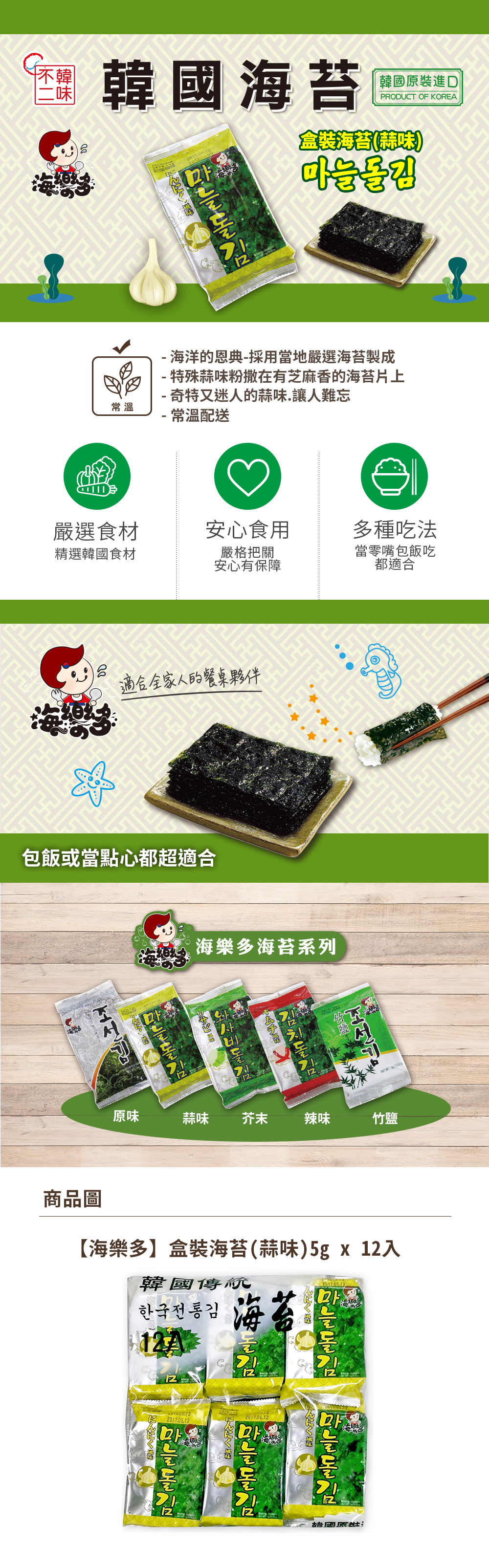 | 成份 | 海苔,玉米油,芝麻油,鹽,蒜粉 |