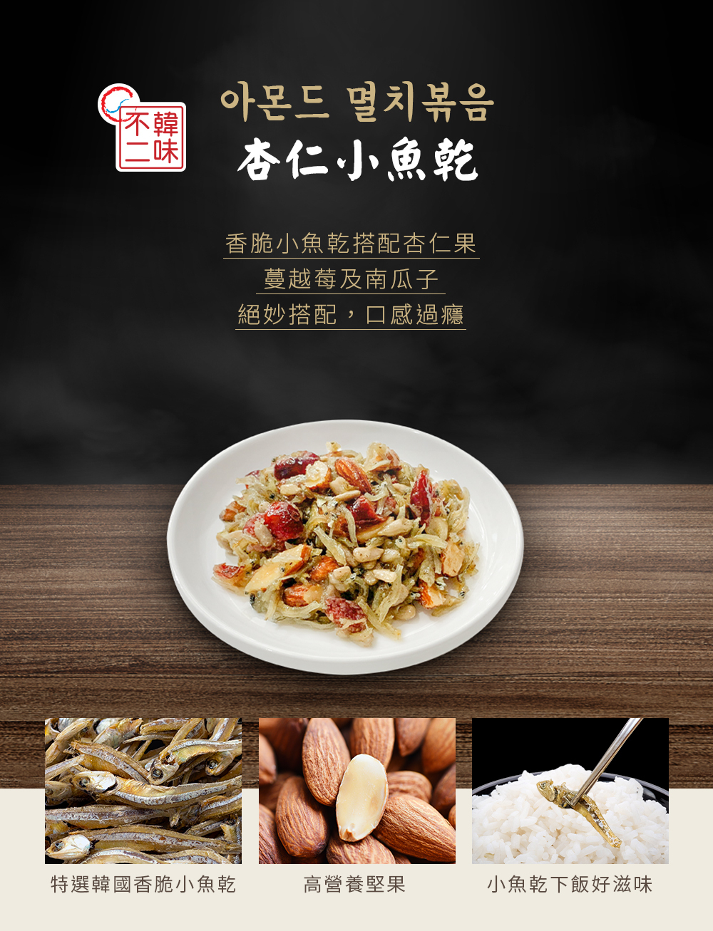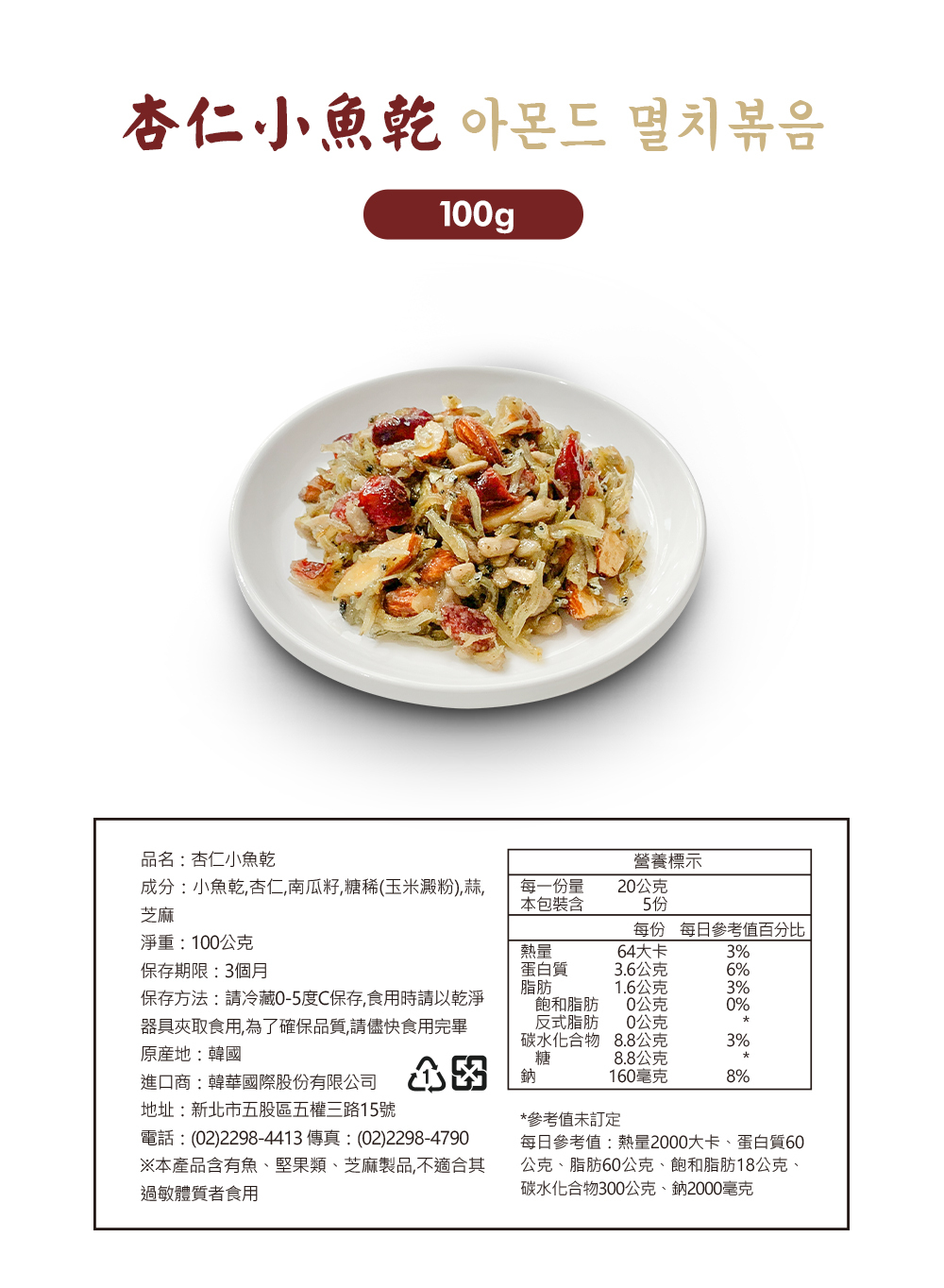 | 成份 | 小魚乾,杏仁,南瓜籽,糖稀,蒜,芝麻 |