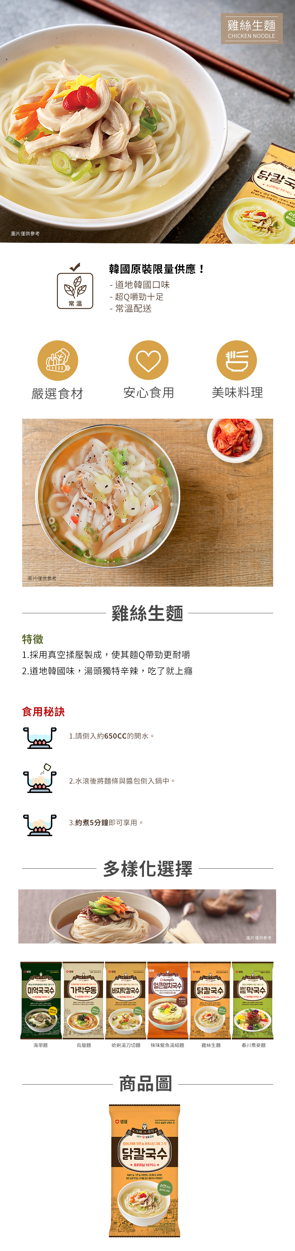 1.在鍋中倒入開水(650CC) 2.水滾後將麵條與醬包倒入鍋中,約煮5分即可食用 |